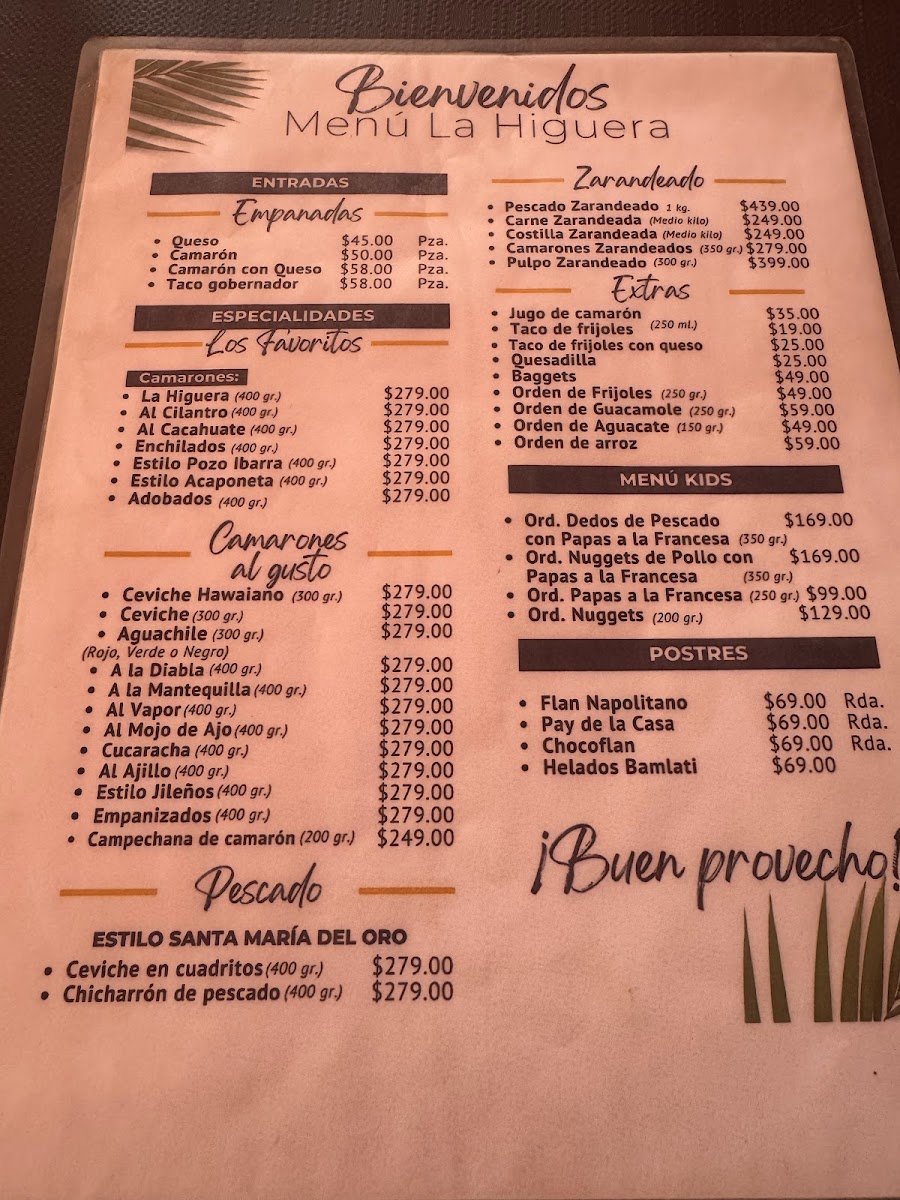 Restaurante La Higuera Carnes y Mariscos, nestled in the heart of Tepic, Mexico, impresses with its vibrant atmosphere and expertly crafted seafood and meat dishes. Renowned for its delectable taco gobernador and delightful camarones al cacahuate, this eatery offers generous portions at approximately $220 per dish, making it a fantastic value. Guests rave about the friendly service and unique offerings, such as the charming "michi vaquita." While some dishes like the shrimp empanada received mixed reviews, the overall dining experience is highly regarded. La Higuera is truly a culinary gem, inviting food lovers to savor the essence of coastal Mexican cuisine.